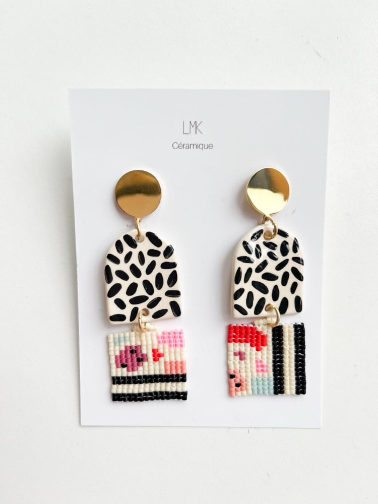 Paire de boucles d'oreilles en céramique, acier inoxydable et tissage de perles myuki réalisée artisanalement par mes soins.